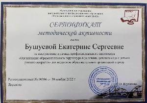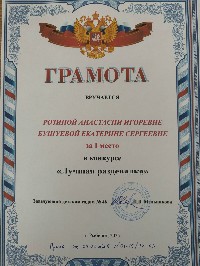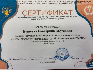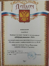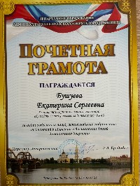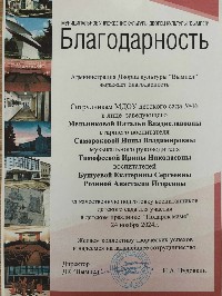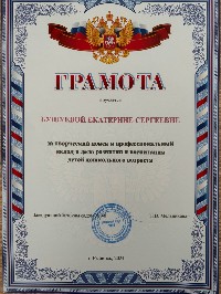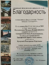 - Грамота муниципального дошкольного образовательного учреждения детского сада № 46 за творческий поиск и профессиональный вклад в дело развития и воспитания детей дошкольного возраста, приказ от 26.05.2024 № 01-15/32-01.
