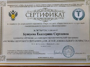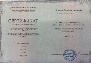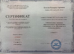 - ГПОАУ ЯО Рыбинский профессионально - педагогический колледж г. Рыбинск, квалификация : воспитатель детей дошкольного возраста с отклонениями в развитии и сохранным развитием, диплом с отличием №117606 0021478, год окончания: 2021;